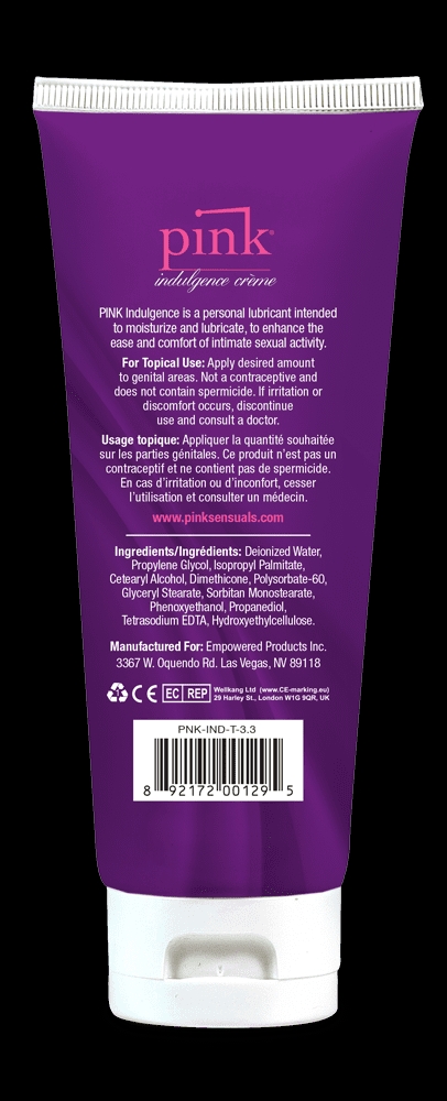 PINK Indulgence Cream is a velvety-smooth water-based crème blend that feels like silk on your body. We added 5% silicone to make it last as long as you want. Slightly thicker texture than our regular water- or silicone-based lubes, you can see and feel the difference. Popular for foreplay and massage. Female, Male, Unisex, Etc. Water Based Formula. (Water Based with 5% Silicone) Long Lasting Texture/Form: Cream Color: White