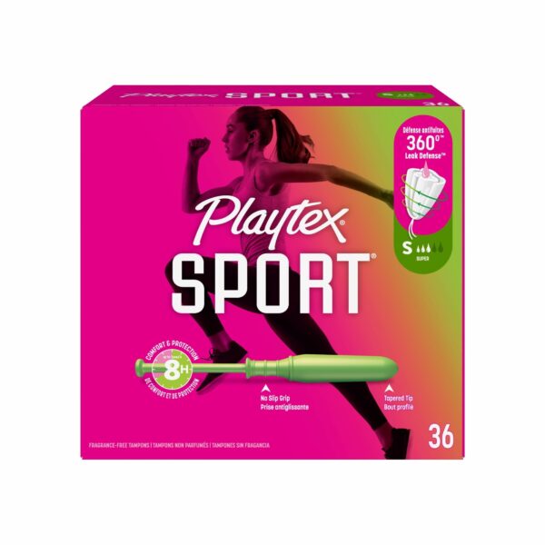 Move without compromise with the #1 Athletic Tampon.* Playtex Sport Tampons are made for movement, featuring 360°™ LEAK DEFENSE™ with FLEXFIT™ technology that stops leaks before they happen. With up to 8 hours of comfort and protection, Playtex Sport Tampons are designed to fit your body and its every move all day long. Our unique tampon applicator has a tapered tip making insertion comfortable and easy, and a NO-SLIP GRIP™ that allows for precise placement. Whether you’re running, jumping, swimming, or stretching, these tampons provide long-lasting comfort and all-around protection for your active lifestyle. Every menstrual cycle is unique, and your daily flow can fluctuate, so we’ve got you covered with a range of 5 absorbencies from Light to Ultra, available in single absorbency packs or tampon multipacks including two or three absorbencies together in one box. These Super tampons for women are fragrance-free. Packaging may vary. *Source: Circana Unify+, Custom Model – Tampon Segment, Total US MULO+ with Convenience; L52 WE 2.9.25