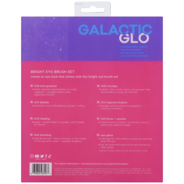 - Galactic Glo Bright Eye Makeup Brush Set includes: (1) RT 039 Lash Groomer, (1) RT 041 Detailer Brush, (1) RT 043 Shading Brush, (1) RT 045 Blending Brush, (1) RT 040 Smudge Brush, (1) RT 042 Tapered Shadow Brush, (1) RT 044 Brow & Spoolie Brush, and (1) Pack of Eye Gems