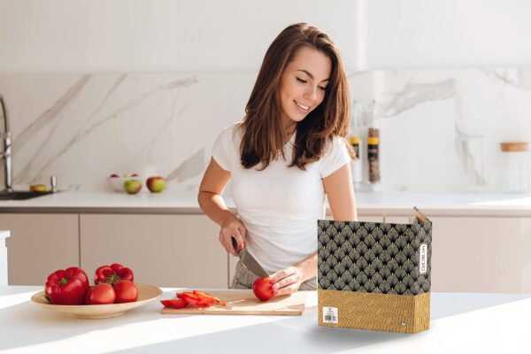 The Full-Page Recipe Organizer Set features a Black & Gold Montage design. The set includes a standard 11.5″ x 12″ 3-ring binder, 50 letter sized clear plastic protector sheets, and 12 divider pages with printed tabs of the most popular recipe categories from appetizers & beverages to dessert. Perfect for all your printed recipes or recipes from magazines. Recipe binder features 2.5″ D-rings. Better Kitchen Products brings you quality products that are inquisitively designed for the best value and best gift-giving options available.