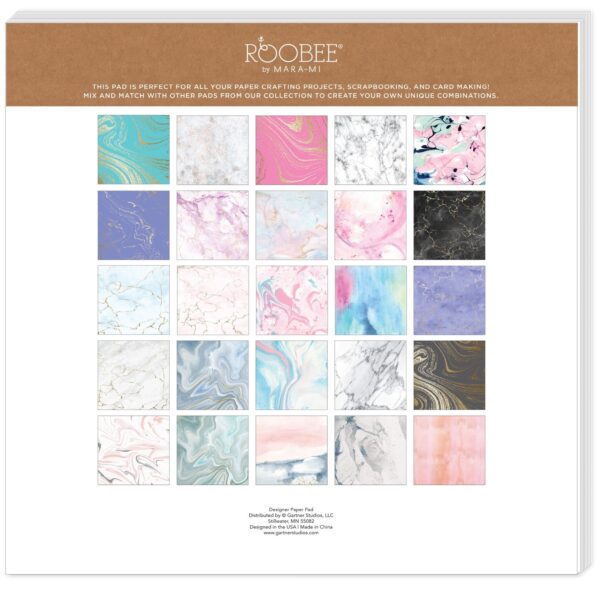 Marble Paper Pad by Roobee by Mara-Mi, your new go-to companion for all things crafting. Whether you’re a seasoned scrapbook enthusiast or a beginner in the DIY crafting arena, this exquisite collection of Marble and Washes Detailed Decorative Paper is designed to inspire and elevate your projects. Discover a palette of sophisticated colors with our selection that includes teal, pink, blush, lavender, and the traditional gray and black marble. These hues are thoughtfully chosen to add a touch of elegance and variety to your creations. With 50 sheets and 25 designs of 12″ x 12″ paper, you have ample opportunity to explore your creativity. This size is perfect for a wide range of projects, from custom cards and scrapbooking to personalized home décor and unique gifts. Each sheet is crafted with 24 lb/110 GSM paper, striking the perfect balance between durability and ease of use. Whether you’re cutting, folding, or layering, this paper maintains its integrity, allowing for seamless crafting experiences.