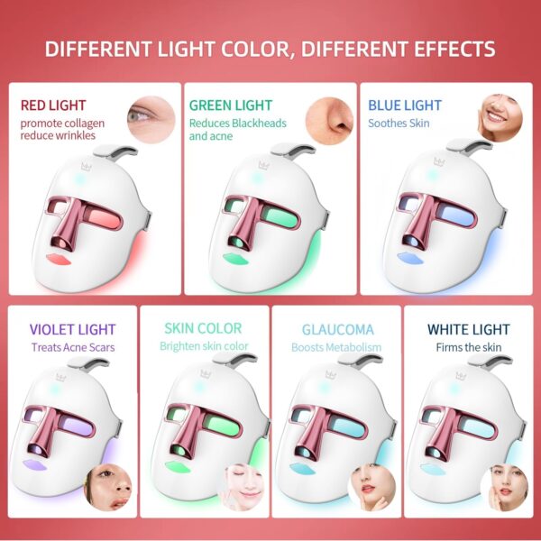 - Revitalize your skin with 7 color light therapy modes: Red light supports skin vitality and promotes a more youthful appearance, Green light helps balance oily skin and manage excess oil, Blue light assists in calming sensitive skin and addressing blemishes for a clearer complexion, Purple light combines red and blue light for improved skin clarity and reduction of marks, Orange light enhances skin tone and helps even out pigmentation, Cyan light supports cellular energy and skin health, and White light penetrates deep to assist in skin renewal and active tissue metabolism.