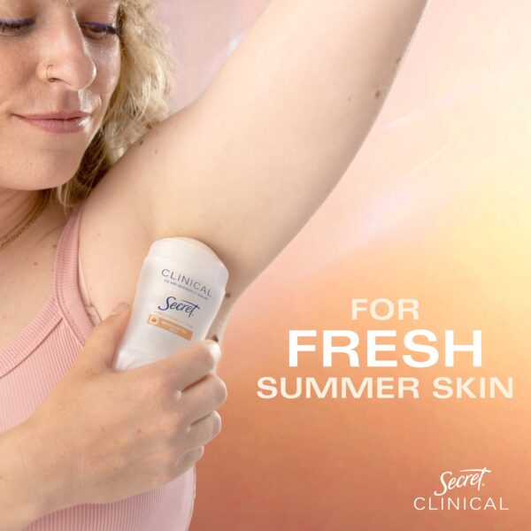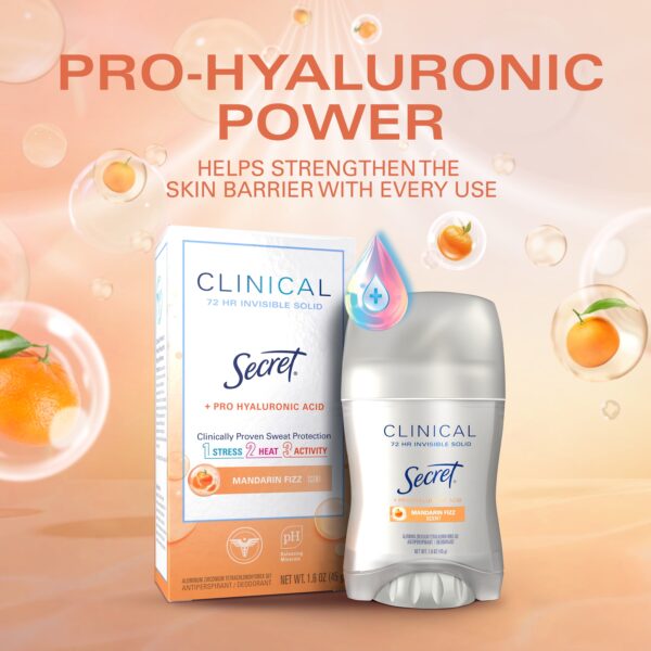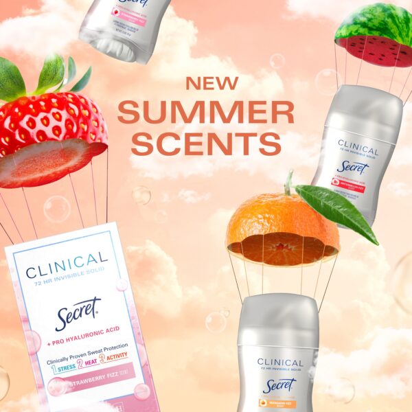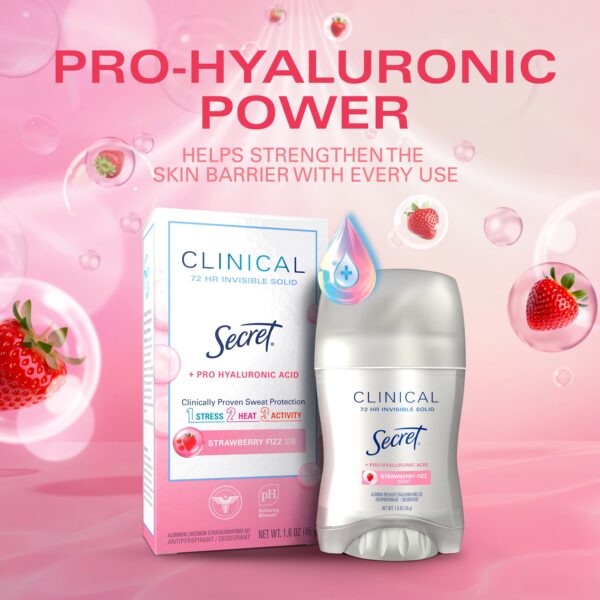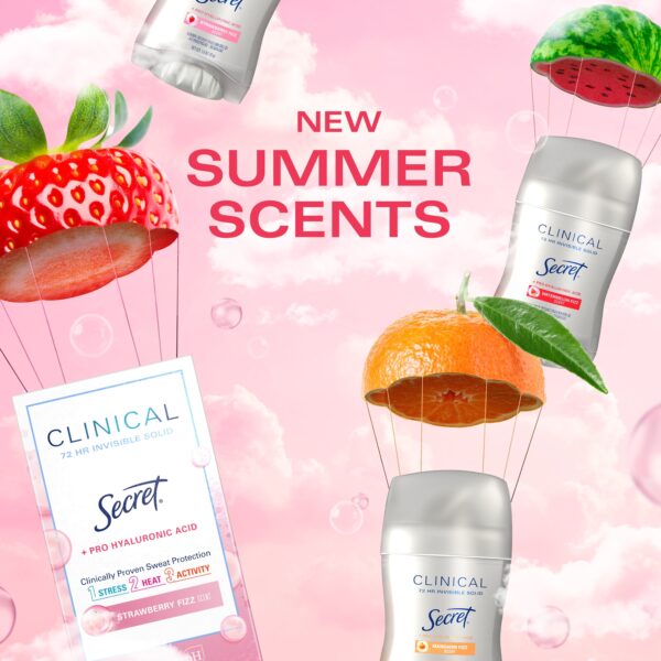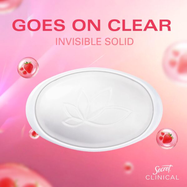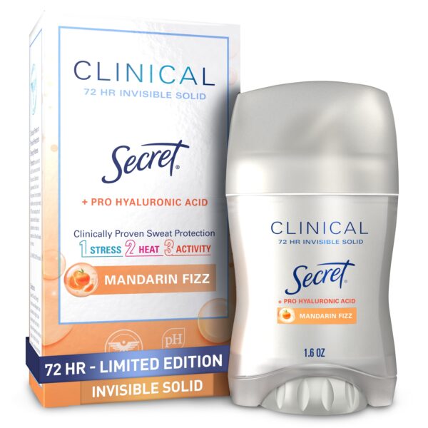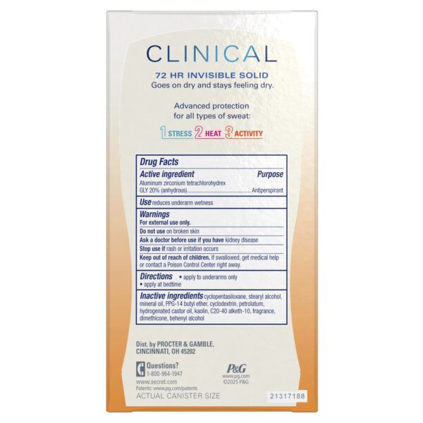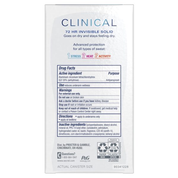 Secret Clinical Strength Antiperspirant and Deodorant for Women, Stress Response is clinically proven women’s deodorant protection for 3 types of sweat; 1) stress sweat, 2) heat sweat and 3) activity sweat. Clinical Strength Antiperspirant and Deodorant for Women goes on dry and stays dry with 8x sweat activated odor fighters vs Secret Original Invisible Solid. Secret Clinical Strength Antiperspirant and Deodorant for Women Invisible Solid-incredible protection, no matter what the day may bring. Secret Clinical Strength Antiperspirant and Deodorant for Women is also available in soft solid and clear gel.