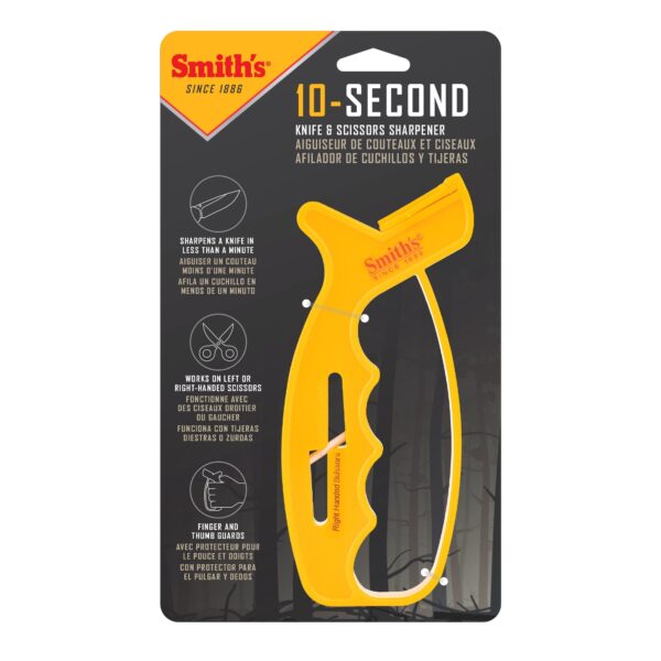 - KNIFE SHARPENER – Smith’s 10-Sec Knife & Scissors Sharpener features a “V” shaped knife sharpening slot with two crossed carbide blades at a preset sharpening angle.
