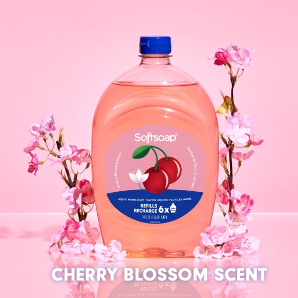- One 50 oz Refill Bottle of Softsoap Limited Edition Cherry Blossom Liquid Hand Soap – This convenient size can refill six 7.5 oz pump bottles
