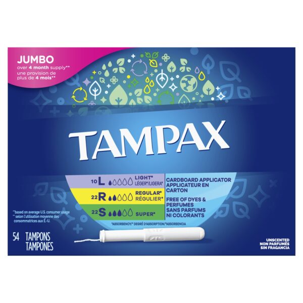 It’s time to Tampax and live your life without limits. Get incredible comfort and protection with Tampax Cardboard tampons made with a LeakGuard Skirt to help stop leaks before they even happen. They feature an Anti-Slip Grip for easy insertion and gently expand to your individual shape thanks to FormFit. Tampax Cardboard Mixed Absorbencies provides you with up to eight hours of protection you can feel good about. Free of dyes, perfume, latex*, BPA, and elemental chlorine bleaching. Ready to ditch the leaks? Get amazing protection with Tampax, the #1 U.S. Gynecologist recommended tampon brand**. Discover your perfect flow combo and get the protection you need. *natural rubber latex **based on 2020 survey. Unscented, 54 Ct. Multi-Pack.