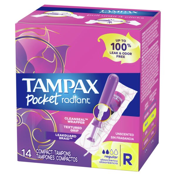 - Tampax Pocket Radiant, regular, compact tampons provide up to 100% leak and odor-free period protection