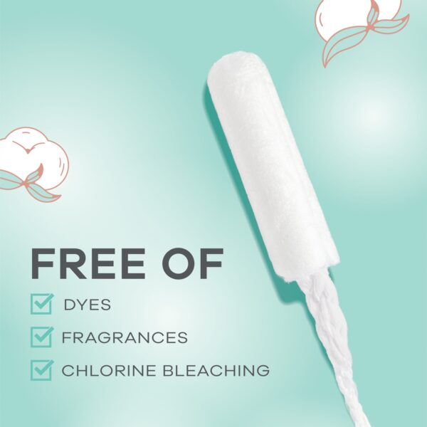 - Tampons free of dyes, fragrances, and chlorine bleaching