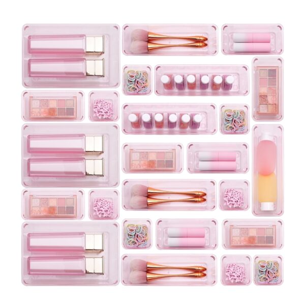 The 25 PCS Clear Plastic Drawer Organizers are a total game-changer for organizing my space! The 4 different sizes made it easy to arrange everything from makeup to office supplies perfectly. The clear design helps me quickly find what I need without rummaging through drawers. They’re sturdy, stackable, and fit seamlessly into any drawer layout. My drawers have never looked this neat—highly recommend this set for anyone looking to declutter!
