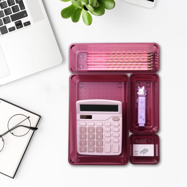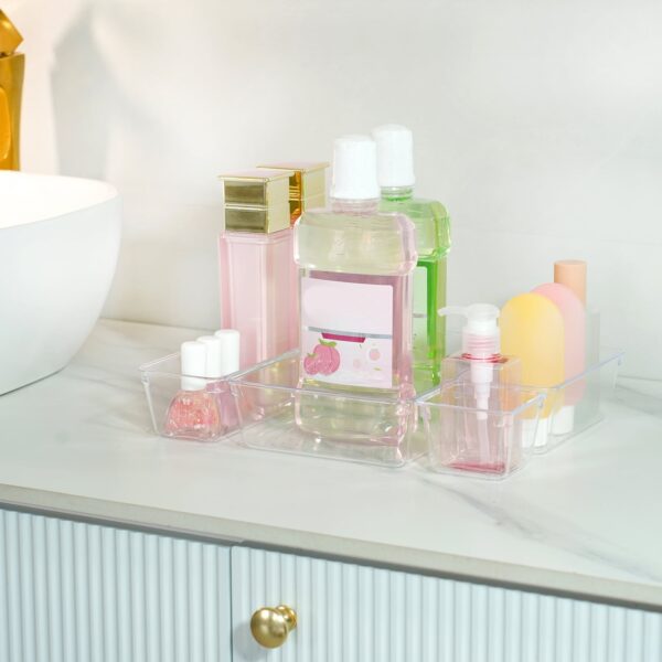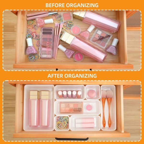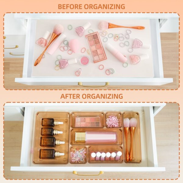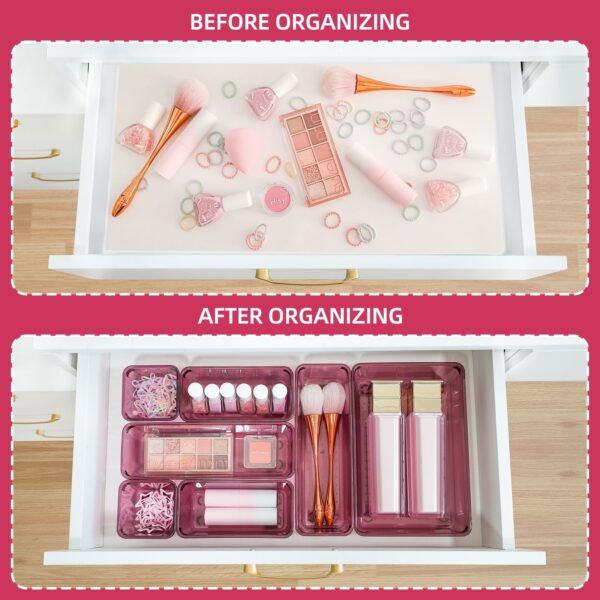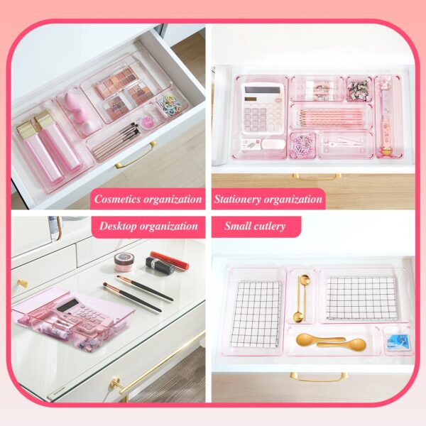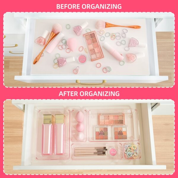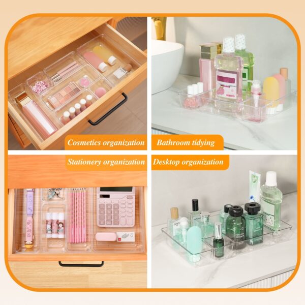 - [ORGANIZE EVERY LITTLE THING]These clear multifunctional drawer divider trays are perfect for placing in various drawers in your home, such as dresser/bathroom/kitchen/office drawers/craft room, ideal for organizing cosmetic products, make-up tools, hair accessories, jewelry, pins, office supplies, craft supplies, tableware and so on.