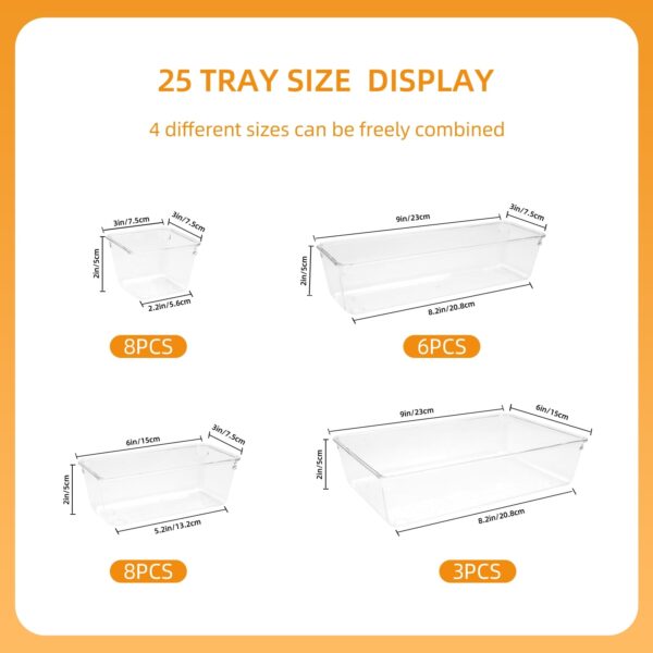 - [4 DIFFERENT SIZE ORGANIZER BOXES] 9 x 6 x 2 inches (3 pcs), 9 x 3x 2 inches (6 pcs), 6 x 3 x 2 inches (8 pcs), 3 x 3 x 2 inches (8 pcs). One set includes 25 organizers in 4 different sizes to help you customize the combination to store items and organize drawers on shelves/closets/cabinets/dressers.