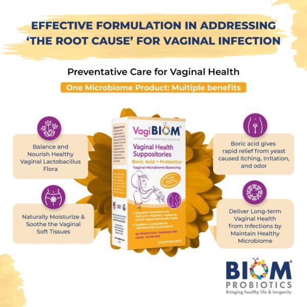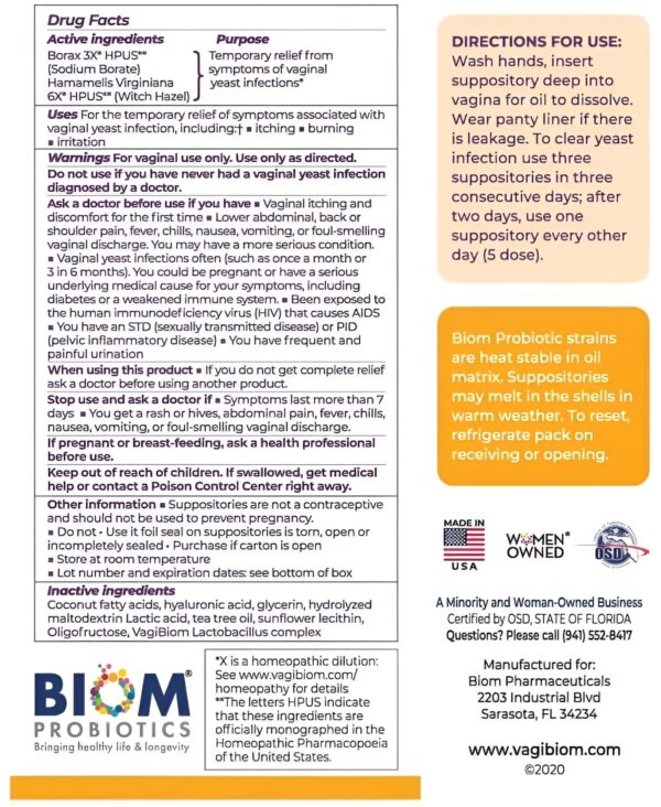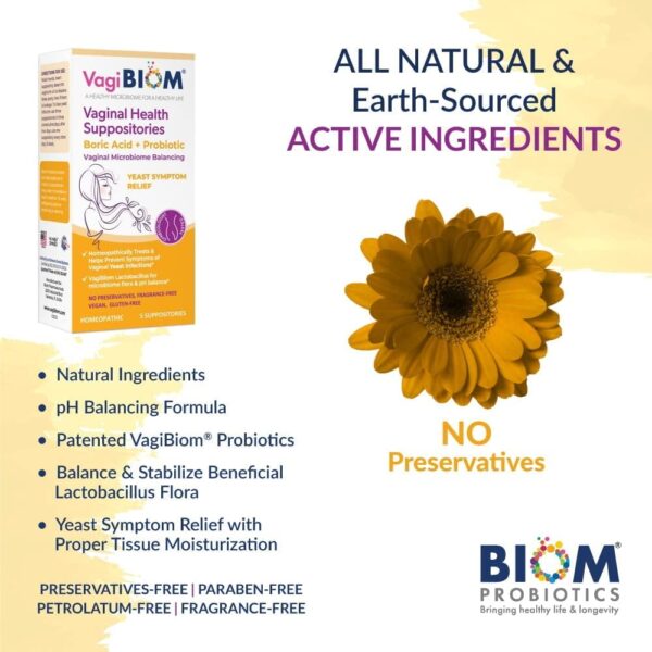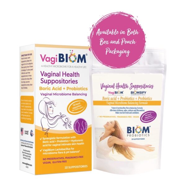 - PROFESSIONALLY RECOMMENDED: Biom Probiotic boric acid vaginal suppositories come with professional recommendations by primary care physicians, gynecologists, pharmacists, and women’s health clinics. With no fragrances, parabens, or other chemicals, the ingredients in the suppository five-pack are natural and vegan, ensuring they’re safe