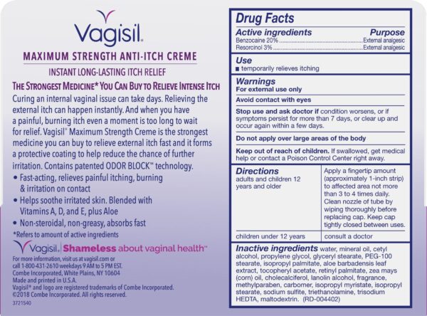Intense vaginal itching and burning happen to many women at one time or another, and Vagisil Anti-Itch Vaginal Cream combats these symptoms. There are many things that could be causing feminine itch. Some of the most common culprits include antibiotics, discharge, imbalance in pH and irritating vaginal conditions. Vagisil Vaginal Cream is specially formulated to deal with these issues. Some women even cite stress as a cause of itch. Vagisil creme relieves even the most painful, burning itch quickly. It forms a protective barrier over delicate skin to help reduce chance of further irritation and provide long-lasting comfort. It’s blended with Vitamins A, D, E and natural Aloe Vera. It’s hypo-allergenic and non-irritating. It’s formulated with patented odor-block technology for extra discretion and comfort. Many women trust Vagisil Vaginal Anti-Itch Creme for a reason.