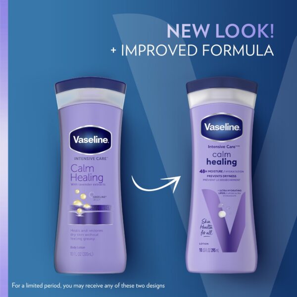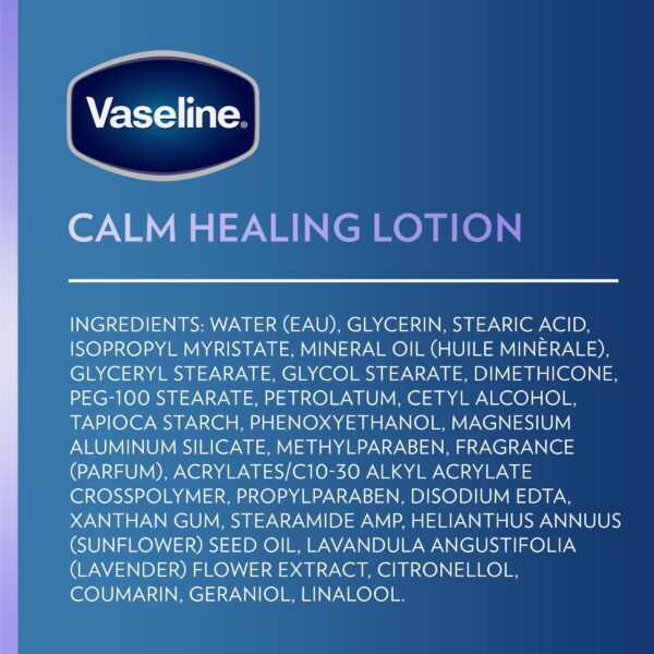 Lavender Extract Heals and Restores Dry skin without feeling greasy. Body Lotion Vaseline Intensive Care Calm Healing Hand and Body Lotion moisturizes dry hands and skin deep down. Vaseline’s Calm Healing Hand and Body Lotion is made with lavender extracts and features a light lavender scent. This moisturizing cream heals and restores dry hands and skin with non-greasy rich hydration. Vaseline body lotion for dry skin with lavender promotes relaxing self-care moments and moisturizes dry skin. This dry hand and body lotion contains microdroplets of Vaseline Jelly to lock in moisture.