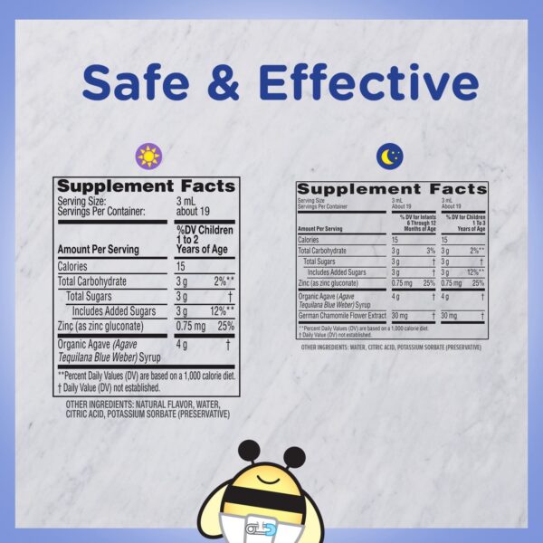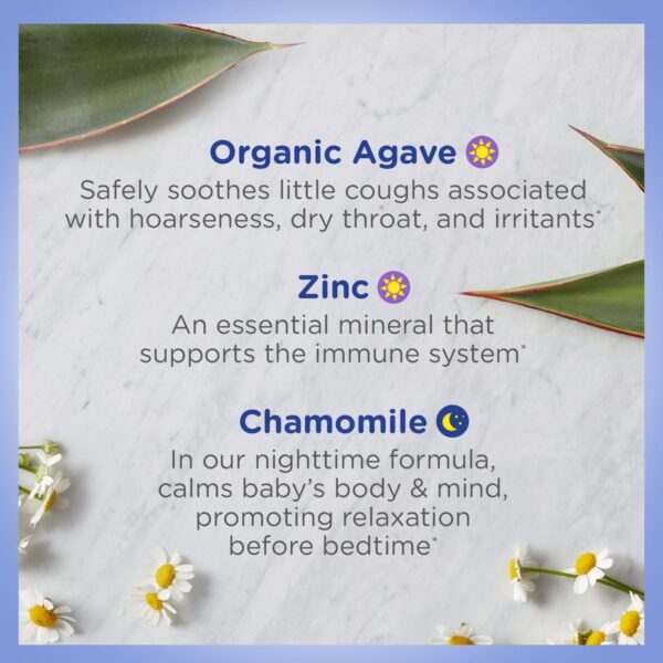 Baby Nighttime Cough Syrup Day & Night Value Pack soothes coughs** and supports the immune system, day & night, with chamomile in our nighttime formula to promotes relaxation before bed*. These cough syrups from Zarbee’s, the #1 pediatrician recommended cough syrup brand for babies & children 12 & under, are made with only a handful of carefully selected ingredients crafted specifically for babies 6+ months. Both syrups contain organic agave to soothe coughs† and zinc to support the immune system*. The nighttime syrup is formulated with chamomile to calm baby’s body & mind, promoting relaxation before bedtime*. These cough syrups are made with no drugs, artificial colors, artificial sweeteners, gluten or dyes and are vegetarian & vegan. **Soothes coughs associated with hoarseness, dry throat & irritants *These statements have not been evaluated by the Food & Drug Administration. This product is not intended to diagnose, treat, cure, or prevent any disease